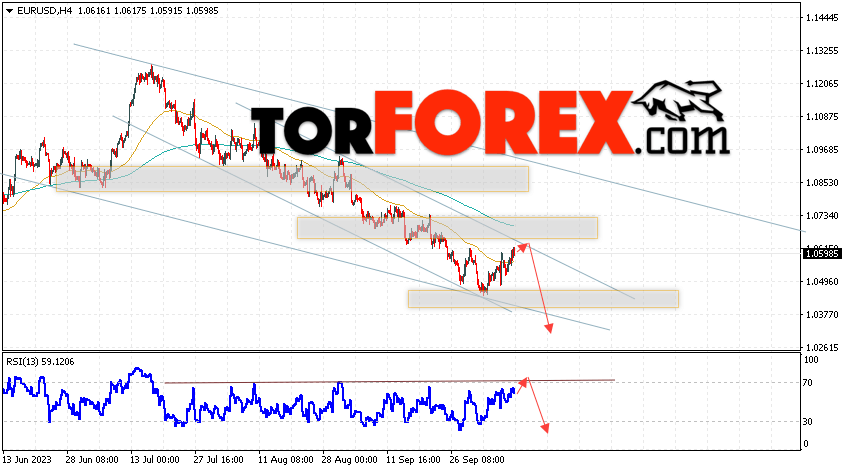 Таким образом, EUR/USD прогноз Евро Доллар на 11 октября 2023 предполагает попытку развития бычьей коррекции пары и тест области сопротивления вблизи уровня 1.0625. Откуда стоит рассматривать отскок цены вниз и попытку продолжения падения валютной пары на рынке в область ниже уровня 1.0365. Дополнительным сигналом в пользу падения инструмента на рынке Форекс выступит тест линии тренда на индикаторе относительной силы (RSI). Отменой варианта со снижением пары EUR/USD станет сильный рост котировок и пробой уровня 1.0705. Это укажет на пробой области сопротивления и продолжение роста валютной пары на Форекс в область выше уровня 1.0885.