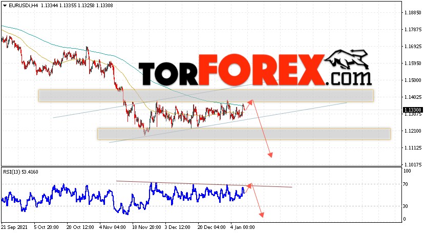 Таким образом, EUR/USD прогноз Евро Доллар на 11 января 2022 предполагает развитие небольшой бычьей коррекции и тест области сопротивления вблизи уровня 1.1355. Откуда стоит рассматривать отскок цены вниз и попытку продолжения падения валютной пары на рынке в область ниже уровня 1.1035. В пользу снижения инструмента на рынке Форекс выступит тест нисходящей линии тренда на индикаторе относительной силы (RSI). Отменой варианта падения пары EUR/USD станет сильный рост котировок и пробой уровня 1.1475. Это укажет на пробой области сопротивления и продолжение подъёма валютной пары на Форекс в область выше уровня 1.1695.