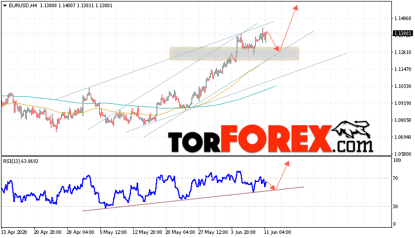 Таким образом, EUR/USD прогноз Евро Доллар на 12 июня 2020 предполагает развитие коррекции и тест области поддержки вблизи уровня 1.1265. Откуда стоит ожидать отскок и попытку продолжения роста пары в область выше уровня 1.1565. В пользу подъёма валютной пары выступит тест линии тренда на индикаторе относительной силы. Отменой варианта роста EUR/USD станет падение и пробой уровня 1.1175. Это укажет на пробой поддержки и продолжение падения валютной пары на Форекс в область ниже уровня 1.1005.