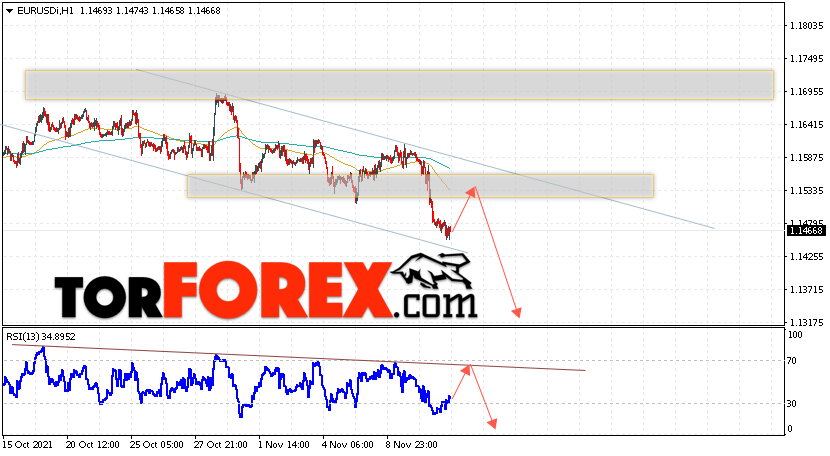 Таким образом, EUR/USD прогноз Евро Доллар на 12 ноября 2021 предполагает развитие бычьей коррекции и тест области сопротивления вблизи уровня 1.1525. Откуда стоит рассматривать отскок цены вниз и попытку продолжения падения валютной пары в область ниже уровня 1.1315. В пользу снижения пары на рынке Форекс выступит тест линии тренда на индикаторе относительной силы (RSI). Отменой варианта падения пары EUR/USD станет сильный рост котировок и пробой уровня 1.1645. Это укажет на пробой области сопротивления и продолжение подъёма валютной пары на Форекс в область выше уровня 1.1855.