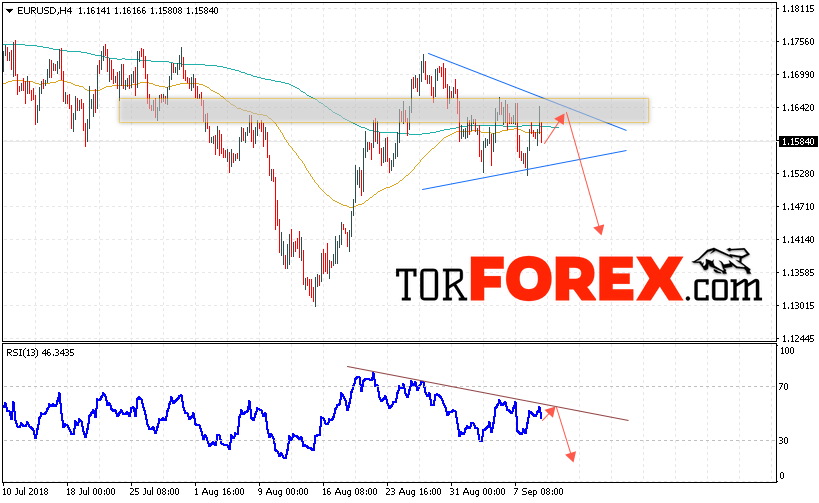 Таким образом, EUR/USD прогноз Евро Доллар на 12 сентября 2018 предполагает попытку теста области сопротивления вблизи уровня 1.1635, откуда стоит ожидать отскок и попытку продолжения падения пары в область ниже уровня 1.1415, в пользу снижения выступит тест линии тренда на индикаторе относительной силы, отменой варианта падения EUR/USD станет сильный рост и пробой уровня 1.1695, что укажет на пробой области сопротивления и продолжение роста пары в область выше уровня 1.1785.
