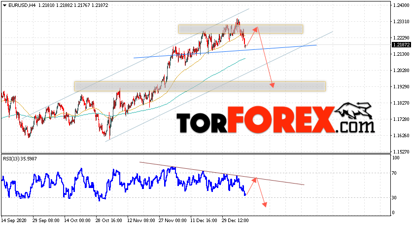 Таким образом, EUR/USD прогноз Евро Доллар на 12 января 2021 предполагает развитие коррекции и тест области сопротивления вблизи уровня 1.2275. Откуда стоит ожидать отскок и попытку продолжения падения пары в область ниже уровня 1.1925. В пользу снижения валютной пары выступит тест линии тренда на индикаторе относительной силы. Отменой варианта падения пары EUR/USD станет сильный рост котировок и пробой уровня 1.2465. Это укажет на пробой области сопротивления и продолжение подъёма валютной пары на Форекс в область выше уровня 1.2675.