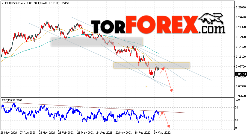 Дополнительным сигналом в пользу падения валютной пары EUR/USD на Форекс выступит тест нисходящей линии тренда на индикаторе относительной силы (RSI), как видим, цена постоянно отталкивается от этой линии и продолжается падение цены. Вторым сигналом станет отскок от верхней границы нисходящего канала. Отменой варианта снижения котировок пары Евро Доллар на текущей торговой неделе 13 — 17 июня 2022, станет сильный рост и пробой уровня 1.1145. Это укажет на пробой области сопротивления и продолжение роста пары в область выше уровня 1.1435. С пробоем области поддержки и закрытием котировок ниже уровня 1.0355 стоит ожидать подтверждения снижения по паре.