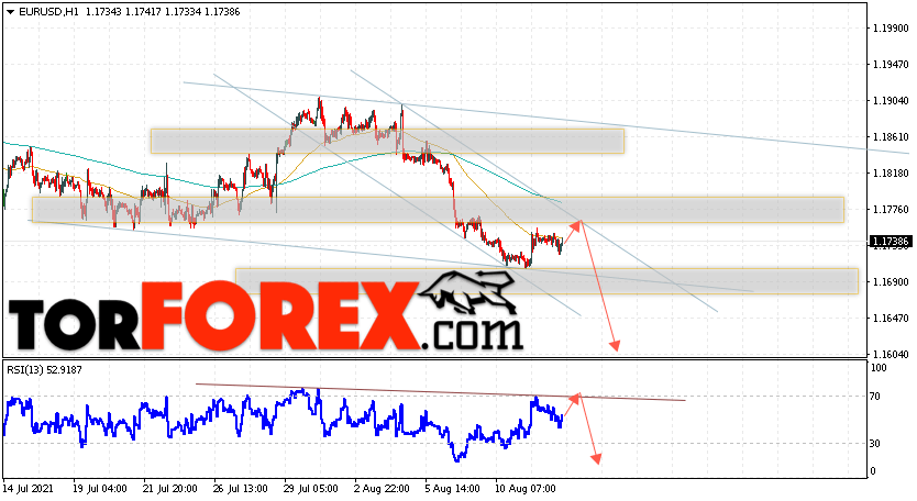 Таким образом, EUR/USD прогноз Евро Доллар на 13 августа 2021 предполагает развитие коррекции и тест области сопротивления вблизи уровня 1.1765. Откуда стоит ожидать отскок и попытку продолжения падения пары в область ниже уровня 1.1585. В пользу падения валютной пары выступит тест линии тренда на индикаторе относительной силы. Отменой варианта снижения пары EUR/USD станет сильный рост котировок и пробой уровня 1.1785. Это укажет на пробой области сопротивления и продолжение подъёма валютной пары на Форекс в область выше уровня 1.2145.