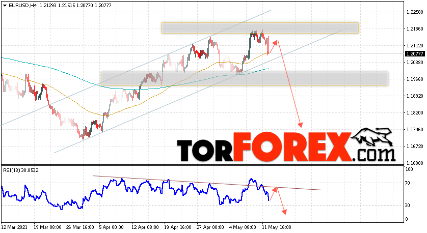 Таким образом, EUR/USD прогноз Евро Доллар на 13 мая 2021 предполагает развитие коррекции и тест области сопротивления вблизи уровня 1.2135. Откуда стоит ожидать отскок и попытку продолжения падения пары в область ниже уровня 1.1745. В пользу падения валютной пары выступит тест линии тренда на индикаторе относительной силы. Отменой варианта снижения пары EUR/USD станет сильный рост котировок и пробой уровня 1.2215. Это укажет на пробой области сопротивления и продолжение подъёма валютной пары на Форекс в область выше уровня 1.2355.