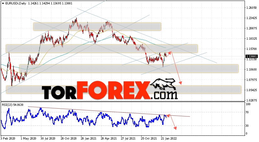 Дополнительным сигналом в пользу падения валютной пары EUR/USD на Форекс выступит тест нисходящей линии тренда на индикаторе относительной силы. Вторым сигналом станет отскок от верхней границы нисходящего канала. Отменой варианта снижения котировок пары Евро Доллар на текущей торговой неделе 14 — 18 февраля 2022, станет сильный рост и пробой уровня 1.1805. Это укажет на пробой области сопротивления и продолжение роста пары в область выше уровня 1.2135. С пробоем области поддержки и закрытием котировок ниже уровня 1.1025 стоит ожидать подтверждения снижения по паре, что также укажет на выход за пределы бычьего канала коррекции.