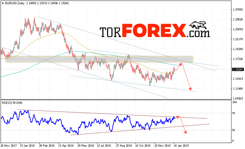 Таким образом, EUR/USD прогноз Евро Доллар на 14 — 18 января 2019 предполагает попытку теста области сопротивления вблизи уровня 1.1585. Откуда стоит ожидать продолжения падения пары в область ниже уровня 1.1145. В пользу падения выступит тест линии тренда на индикаторе относительной силы. Отменой варианта снижения евро доллар станет сильный рост и пробой уровня 1.1760. В этом случае стоит ожидать продолжения роста пары с потенциальной целью на уровне 1.2050.