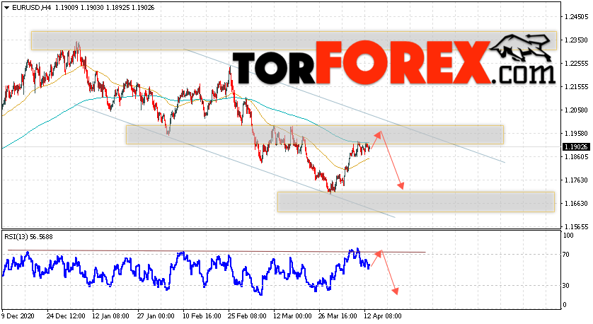 Таким образом, EUR/USD прогноз Евро Доллар на 14 апреля 2021 предполагает развитие коррекции и тест области сопротивления вблизи уровня 1.1955. Откуда стоит ожидать отскок и попытку продолжения падения пары в область ниже уровня 1.1685. В пользу падения валютной пары выступит тест линии тренда на индикаторе относительной силы. Отменой варианта снижения пары EUR/USD станет сильный рост котировок и пробой уровня 1.2065. Это укажет на пробой области сопротивления и продолжение подъёма валютной пары на Форекс в область выше уровня 1.2275.