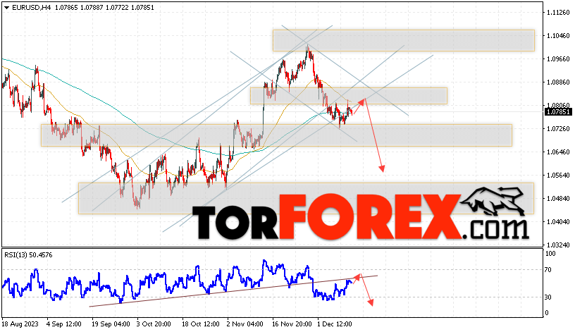 Таким образом, EUR/USD прогноз Евро Доллар на 14 декабря 2023 предполагает попытку развития коррекции пары и тест области сопротивления вблизи уровня 1.0825. Откуда стоит рассматривать отскок цены пары Евро Доллар вниз и попытку продолжения падения актива на рынке в область ниже уровня 1.0565. Дополнительным сигналом в пользу снижения инструмента на рынке Форекс выступит тест линии тренда на индикаторе относительной силы (RSI). Отменой варианта падения пары EUR/USD станет сильный рост котировок и пробой уровня 1.0905. Это укажет на пробой области сопротивления и продолжение роста валютной пары на Форекс в область выше уровня 1.1245.