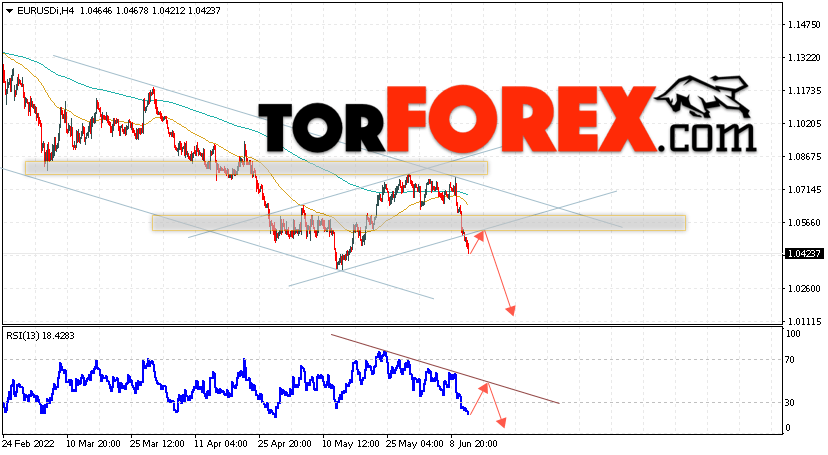 Таким образом, EUR/USD прогноз Евро Доллар на 14 июня 2022 предполагает попытку развития бычьей коррекции и тест области сопротивления вблизи уровня 1.0475. Откуда стоит рассматривать отскок цены вниз и попытку продолжения падения валютной пары на рынке в область ниже уровня 1.0115. В пользу снижения инструмента на рынке Форекс выступит тест нисходящей линии тренда на индикаторе относительной силы (RSI). Отменой варианта падения пары EUR/USD станет сильный рост котировок и пробой уровня 1.0785. Это укажет на пробой области сопротивления и продолжение подъёма валютной пары на Форекс в область выше уровня 1.1065.