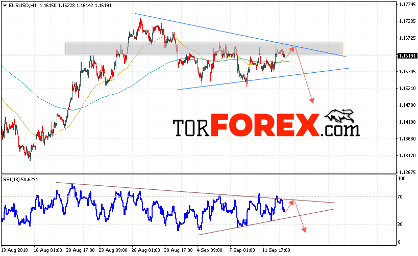 Таким образом, EUR/USD прогноз Евро Доллар на 14 сентября 2018 предполагает попытку теста области сопротивления вблизи уровня 1.1630, откуда стоит ожидать отскок и попытку продолжения падения пары в область ниже уровня 1.1470, в пользу снижения выступит тест линии тренда на индикаторе относительной силы, отменой варианта падения EUR/USD станет сильный рост и пробой уровня 1.1695, что укажет на пробой границы модели «Треугольник» и продолжение роста пары в область выше уровня 1.1785.