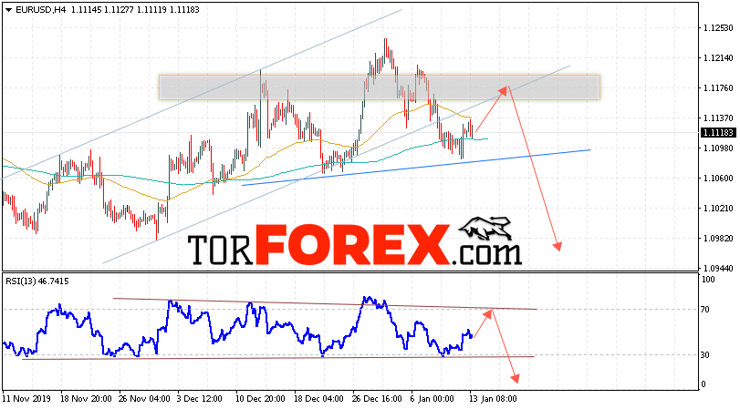 Таким образом, EUR/USD прогноз Евро Доллар на 14 января 2020 предполагает развитие коррекции и тест области сопротивления вблизи уровня 1.1180. Откуда стоит ожидать отскок и попытку продолжения падения пары в область ниже уровня 1.0965. В пользу снижения валютной пары выступит тест линии тренда на индикаторе относительной силы. Отменой варианта падения EUR/USD станет сильный рост и пробой уровня 1.1265. Это укажет на пробой сопротивления и продолжение роста пары в область выше уровня 1.1465.