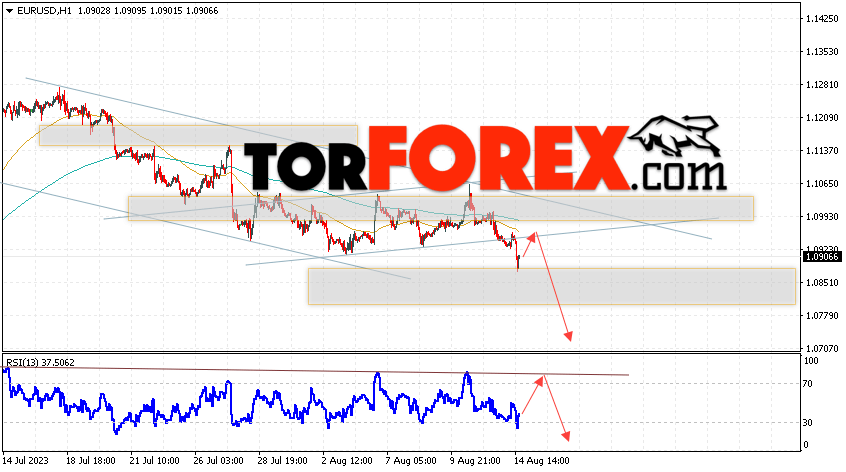 Валютная пара Евро Доллар EUR/USD продолжает движение в рамках падения и нисходящего канала. Скользящие средние указывают на наличие краткосрочной медвежьей тенденции по паре. Цены пробили область между сигнальными линиями вниз, что указывает на давление со стороны продавцов европейской валюты и потенциальное продолжение падения котировок актива уже с текущих уровней. В момент публикации прогноза курс Евро к Доллару США составляет 1.0906. В рамках Форекс прогноза на 15 августа 2023 стоит ожидать попытку развития бычьей коррекции цены и тест уровня сопротивления, который располагается на паре EUR/USD вблизи области 1.0935. Далее, отскок цен вниз и продолжение падения валютной пары Евро Доллар. Потенциальной целью такого движения на FOREX выступает область ниже уровня 1.0705.