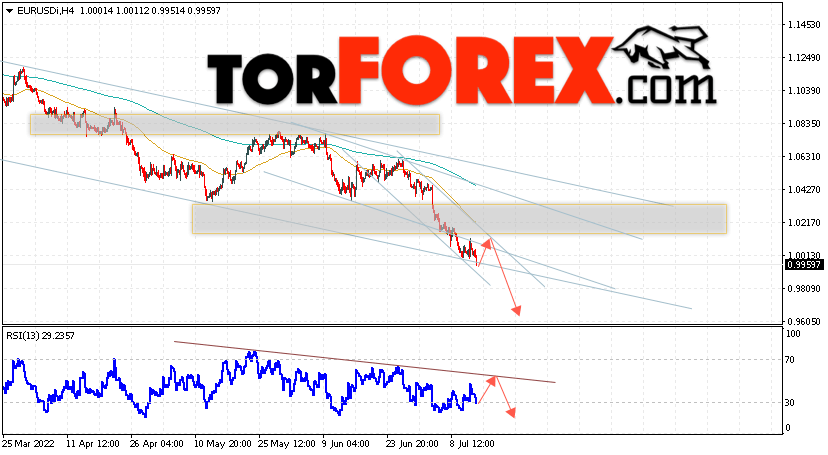 Таким образом, EUR/USD прогноз Евро Доллар на 15 июля 2022 предполагает попытку развития бычьей коррекции и тест области сопротивления вблизи уровня 1.0055. Откуда стоит рассматривать отскок цены вниз и попытку продолжения падения валютной пары на рынке в область ниже уровня 0.9605. В пользу снижения инструмента на рынке Форекс выступит тест нисходящей линии тренда на индикаторе относительной силы (RSI). Отменой варианта падения пары EUR/USD станет сильный рост котировок и пробой уровня 1.0235. Это укажет на пробой области сопротивления и продолжение подъёма валютной пары на Форекс в область выше уровня 1.0475.