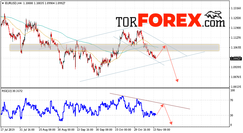 Таким образом, EUR/USD прогноз Евро Доллар на 15 ноября 2019 предполагает попытку коррекции и тест области сопротивления вблизи уровня 1.1055. Откуда стоит ожидать отскок и попытку продолжения падения пары в область ниже уровня 1.0865. В пользу снижения валютной пары выступит тест линии тренда на индикаторе относительной силы. Отменой варианта падения EUR/USD станет сильный рост и пробой уровня 1.1125. Это укажет на пробой сопротивления и продолжение роста пары в область выше уровня 1.1265.