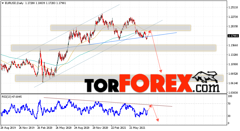 Дополнительным сигналом в пользу падения валютной пары EUR/USD на Форекс выступит тест нисходящей линии тренда на индикаторе относительной силы, как видим, уже было несколько отскоков от данной линии, не исключено, что очередной тест линии сопротивления даст хороший сигнал к продолжению снижения Евро против Доллара США. Вторым сигналом станет отскок от нижней границы бычьего канала, который был пробит медведями вниз. Отменой варианта снижения котировок пары Евро Доллар на текущей торговой неделе 16 — 20 августа 2021, станет сильный рост и пробой уровня 1.2305. Это укажет на пробой области сопротивления и продолжение роста пары в область выше уровня 1.2705. С пробоем области поддержки и закрытием котировок ниже уровня 1.1605, что укажет на пробой линии ”Шеи” разворотной модели ”Голова и плечи”.