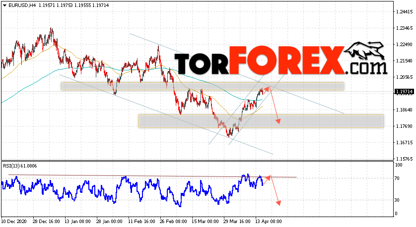 Таким образом, EUR/USD прогноз Евро Доллар на 16 апреля 2021 предполагает развитие коррекции и тест области сопротивления вблизи уровня 1.1975. Откуда стоит ожидать отскок и попытку продолжения падения пары в область ниже уровня 1.1765. В пользу падения валютной пары выступит тест линии тренда на индикаторе относительной силы. Отменой варианта снижения пары EUR/USD станет сильный рост котировок и пробой уровня 1.2065. Это укажет на пробой области сопротивления и продолжение подъёма валютной пары на Форекс в область выше уровня 1.2245.