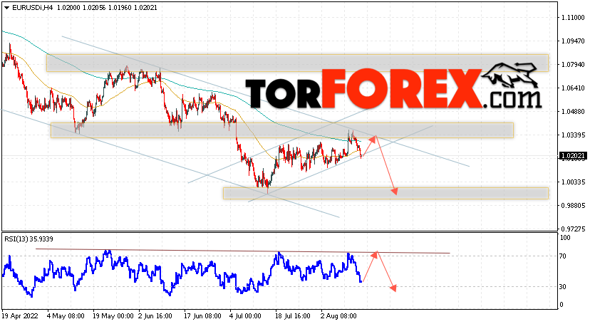 Таким образом, EUR/USD прогноз Евро Доллар на 16 августа 2022 предполагает попытку развития бычьей коррекции и тест области сопротивления вблизи уровня 1.0305. Откуда стоит рассматривать отскок цены вниз и попытку продолжения падения валютной пары на рынке в область ниже уровня 0.9895. В пользу снижения инструмента на рынке Форекс выступит тест нисходящей линии тренда на индикаторе относительной силы (RSI). Отменой варианта падения пары EUR/USD станет сильный рост котировок и пробой уровня 1.0485. Это укажет на пробой области сопротивления и продолжение подъёма валютной пары на Форекс в область выше уровня 1.0675.