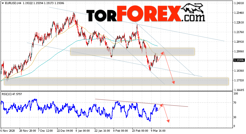 Таким образом, EUR/USD прогноз Евро Доллар на 16 марта 2021 предполагает развитие коррекции и тест области сопротивления вблизи уровня 1.2005. Откуда стоит ожидать отскок и попытку продолжения падения пары в область ниже уровня 1.1675. В пользу снижения валютной пары выступит тест линии тренда на индикаторе относительной силы. Отменой варианта падения пары EUR/USD станет сильный рост котировок и пробой уровня 1.2085. Это укажет на пробой области сопротивления и продолжение подъёма валютной пары на Форекс в область выше уровня 1.2405.