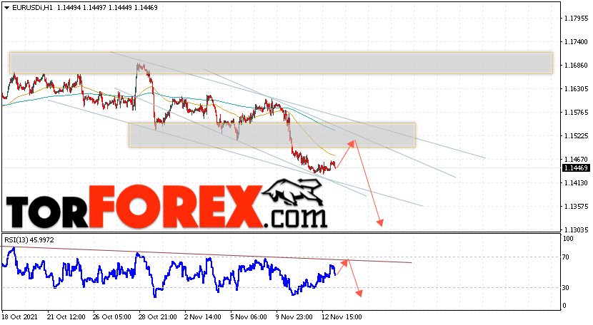 Таким образом, EUR/USD прогноз Евро Доллар на 16 ноября 2021 предполагает развитие бычьей коррекции и тест области сопротивления вблизи уровня 1.1475. Откуда стоит рассматривать отскок цены вниз и попытку продолжения падения валютной пары в область ниже уровня 1.1305. В пользу снижения пары на рынке Форекс выступит тест линии тренда на индикаторе относительной силы (RSI). Отменой варианта падения пары EUR/USD станет сильный рост котировок и пробой уровня 1.1615. Это укажет на пробой области сопротивления и продолжение подъёма валютной пары на Форекс в область выше уровня 1.1745.