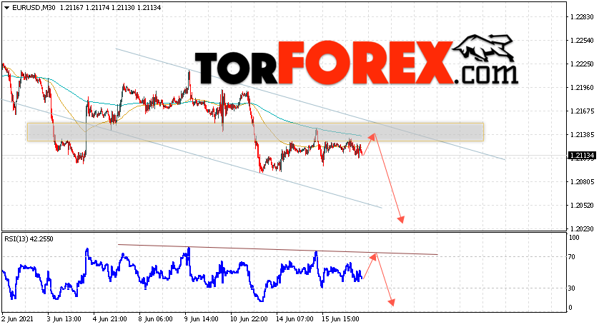Таким образом, EUR/USD прогноз Евро Доллар на 17 июня 2021 предполагает развитие коррекции и тест области сопротивления вблизи уровня 1.2140. Откуда стоит ожидать отскок и попытку продолжения падения пары в область ниже уровня 1.2025. В пользу падения валютной пары выступит тест линии тренда на индикаторе относительной силы. Отменой варианта снижения пары EUR/USD станет сильный рост котировок и пробой уровня 1.2175. Это укажет на пробой области сопротивления и продолжение подъёма валютной пары на Форекс в область выше уровня 1.2375.