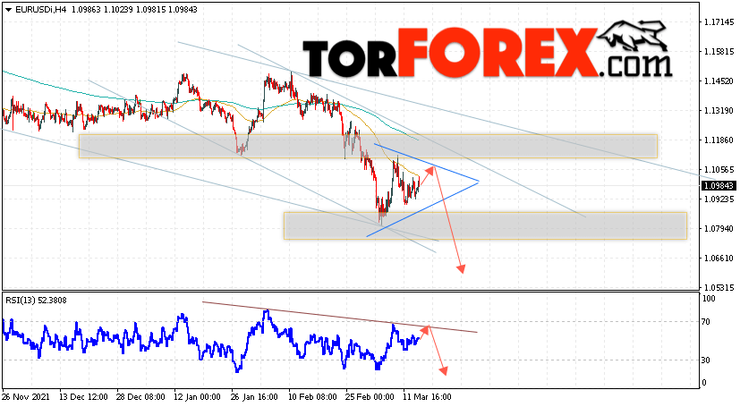 Таким образом, EUR/USD прогноз Евро Доллар на 17 марта 2022 предполагает попытку продолжения развития бычьей коррекции и тест области сопротивления вблизи уровня 1.1055. Откуда стоит рассматривать отскок цены вниз и попытку продолжения падения валютной пары на рынке в область ниже уровня 1.0525. В пользу снижения инструмента на рынке Форекс выступит тест нисходящей линии тренда на индикаторе относительной силы (RSI). Отменой варианта падения пары EUR/USD станет сильный рост котировок и пробой уровня 1.1205. Это укажет на пробой области сопротивления и продолжение подъёма валютной пары на Форекс в область выше уровня 1.1435.