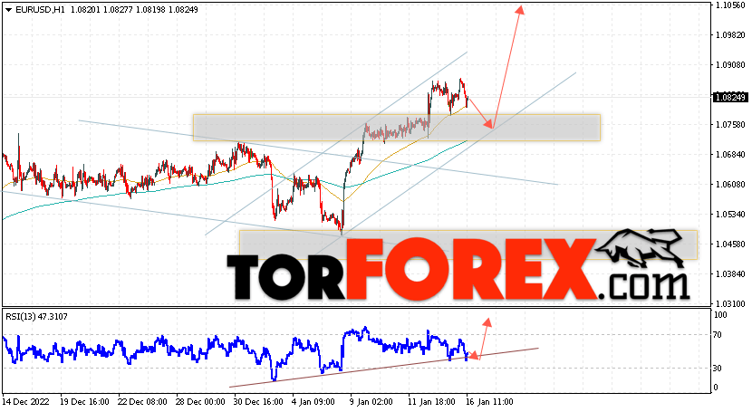Таким образом, EUR/USD прогноз Евро Доллар на 17 января 2023 предполагает попытку развития коррекции пары и тест области поддержки вблизи уровня 1.0745. Откуда стоит рассматривать отскок цены вверх и попытку продолжения роста валютной пары на рынке в область выше уровня 1.1065. В пользу подъёма инструмента на рынке Форекс выступит тест линии тренда на индикаторе относительной силы (RSI). Отменой варианта роста пары EUR/USD станет падение котировок и пробой уровня 1.0665. Это укажет на пробой области поддержки и продолжение падения валютной пары на Форекс в область ниже уровня 1.0445.