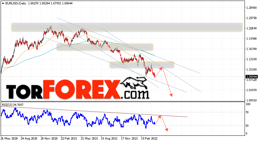 Дополнительным сигналом в пользу падения валютной пары EUR/USD на Форекс выступит тест нисходящей линии тренда на индикаторе относительной силы (RSI). Вторым сигналом станет отскок от верхней границы нисходящего канала. Отменой варианта снижения котировок пары Евро Доллар на текущей торговой неделе 18 — 22 апреля 2022, станет сильный рост и пробой уровня 1.1305. Это укажет на пробой области сопротивления и продолжение роста пары в область выше уровня 1.1645. С пробоем области поддержки и закрытием котировок ниже уровня 1.0675 стоит ожидать подтверждения снижения по паре.