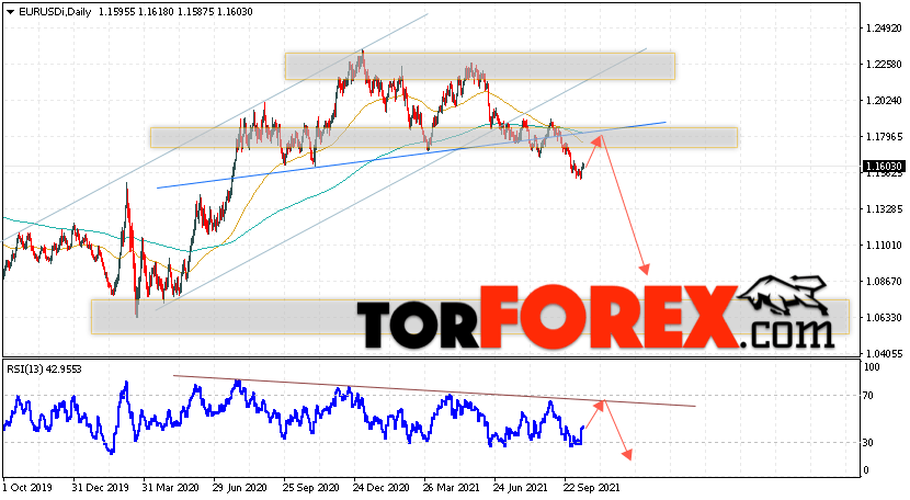 Дополнительным сигналом в пользу падения валютной пары EUR/USD на Форекс выступит тест нисходящей линии тренда на индикаторе относительной силы. Вторым сигналом станет отскок от линии ”Шеи” разворотной модели ”Голова и плечи”. Отменой варианта снижения котировок пары Евро Доллар на текущей торговой неделе 18 — 22 октября 2021, станет сильный рост и пробой уровня 1.2275. Это укажет на пробой области сопротивления и продолжение роста пары в область выше уровня 1.2745. С пробоем области поддержки и закрытием котировок ниже уровня 1.1385.
