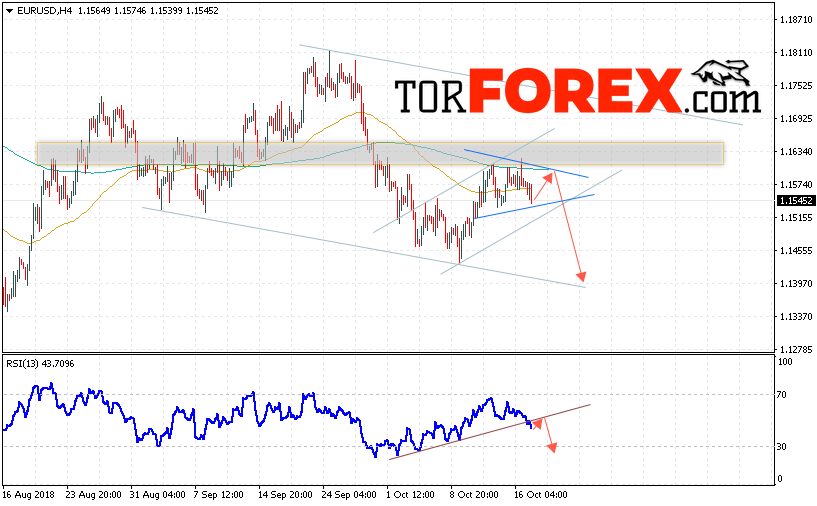 Таким образом, EUR/USD прогноз Евро Доллар на 18 октября 2018 предполагает попытку теста области сопротивления вблизи уровня 1.1585, откуда стоит ожидать отскок и попытку продолжения снижения пары в область ниже уровня 1.1400, в пользу падения выступит тест линии тренда на индикаторе относительной силы, отменой варианта падения EUR/USD станет сильный рост и пробой уровня 1.1655, что укажет на пробой сопротивления и продолжение роста пары в область выше уровня 1.1745.