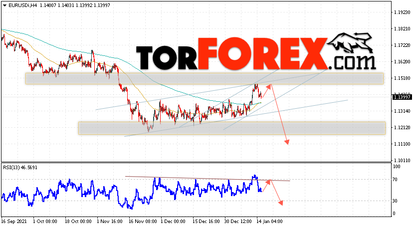 Таким образом, EUR/USD прогноз Евро Доллар на 18 января 2022 предполагает развитие небольшой бычьей коррекции и тест области сопротивления вблизи уровня 1.1485. Откуда стоит рассматривать отскок цены вниз и попытку продолжения падения валютной пары на рынке в область ниже уровня 1.1115. В пользу снижения инструмента на рынке Форекс выступит тест нисходящей линии тренда на индикаторе относительной силы (RSI). Отменой варианта падения пары EUR/USD станет сильный рост котировок и пробой уровня 1.1545. Это укажет на пробой области сопротивления и продолжение подъёма валютной пары на Форекс в область выше уровня 1.1795.