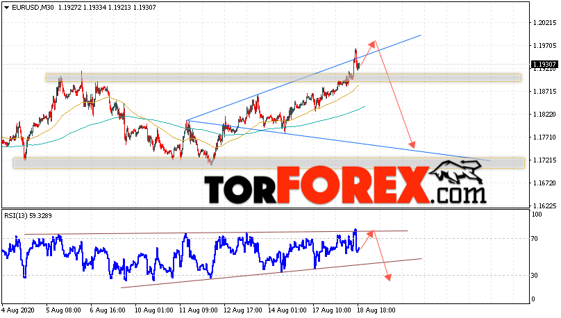 Таким образом, EUR/USD прогноз Евро Доллар на 19 августа 2020 предполагает развитие коррекции и тест области сопротивления вблизи уровня 1.1975. Откуда стоит ожидать отскок и попытку продолжения падения пары в область ниже уровня 1.1725. В пользу снижения валютной пары выступит тест линии тренда на индикаторе относительной силы. Отменой варианта падения EUR/USD станет сильный рост и пробой уровня 1.2035. Это укажет на пробой сопротивления и продолжение подъёма валютной пары на Форекс в область выше уровня 1.2325.