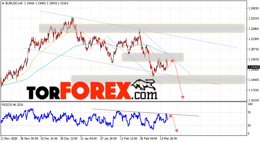 Таким образом, EUR/USD прогноз Евро Доллар на 19 марта 2021 предполагает развитие коррекции и тест области сопротивления вблизи уровня 1.1985. Откуда стоит ожидать отскок и попытку продолжения падения пары в область ниже уровня 1.1635. В пользу снижения валютной пары выступит тест линии тренда на индикаторе относительной силы. Отменой варианта падения пары EUR/USD станет сильный рост котировок и пробой уровня 1.2075. Это укажет на пробой области сопротивления и продолжение подъёма валютной пары на Форекс в область выше уровня 1.2395.