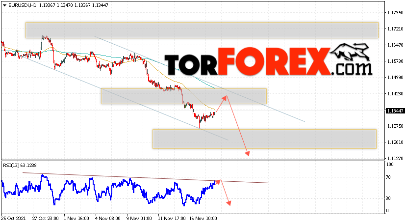 Таким образом, EUR/USD прогноз Евро Доллар на 19 ноября 2021 предполагает развитие бычьей коррекции и тест области сопротивления вблизи уровня 1.1385. Откуда стоит рассматривать отскок цен вниз и попытку продолжения падения валютной пары на рынке в область ниже уровня 1.1125. В пользу снижения инструмента на рынке Форекс выступит тест нисходящей линии тренда на индикаторе относительной силы (RSI). Отменой варианта падения пары EUR/USD станет сильный рост котировок и пробой уровня 1.1495. Это укажет на пробой области сопротивления и продолжение подъёма валютной пары на Форекс в область выше уровня 1.1655.