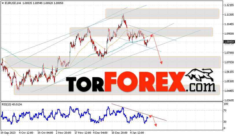 Валютная пара Евро Доллар EUR/USD продолжает движение в рамках развития падения и покинула пределы восходящего канала. Скользящие средние указывают на наличие краткосрочной бычьей тенденции по паре. Цены пробили область между сигнальными линиями вниз, что указывает на давление со стороны продавцов европейской валюты и потенциальное продолжение падения котировок пары актива уже с текущих уровней. В момент публикации прогноза курс Евро к Доллару США составляет 1.0876. В рамках Форекс прогноза на 19 января 2024 стоит ожидать попытку развития бычьей коррекции цены и тест уровня сопротивления, который располагается на паре EUR/USD вблизи области 1.0945. Далее, отскок цен вниз и продолжение падения валютной пары Евро Доллар. Потенциальной целью такого движения на FOREX выступает область ниже уровня 1.0685.