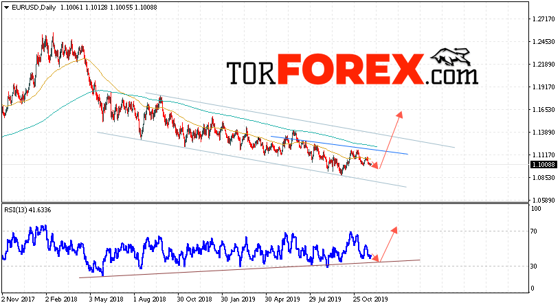 В пользу роста валютной пары EUR/USD на Форекс выступит тест восходящей линии тренда на индикаторе относительной силы, как видим, значения индикатора уже отталкивались от данной линии несколько раз. Вторым сигналом может стать завершение формирования разворотной модели «Голова и плечи». Отменой варианта роста котировок пары Евро Доллар на текущей торговой неделе 2 — 6 декабря 2019, станет падение и пробой уровня 1.0855. Это укажет на пробой области поддержки и продолжения падения пары в область ниже уровня 1.0405. С пробоем верхней границы нисходящего канала и закрытием котировок выше уровня 1.1245 стоит ожидать подтверждения развития бычьего движения по паре.