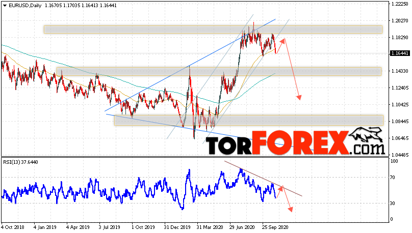 Дополнительным сигналом в пользу падения валютной пары EUR/USD на Форекс выступит тест линии сопротивления на индикаторе относительной силы. Вторым сигналом станет отскок от нижней границы восходящего канала. Отменой варианта падения котировок пары Евро Доллар на текущей торговой неделю 2 — 6 ноября 2020, станет сильный рост и пробой уровня 1.2035. Это укажет на пробой области сопротивления и продолжения роста пары в область выше уровня 1.2295. С пробоем области поддержки и закрытием котировок ниже уровня 1.1585, что укажет на завершение формирования разворотной модели ”Двойная вершина”.