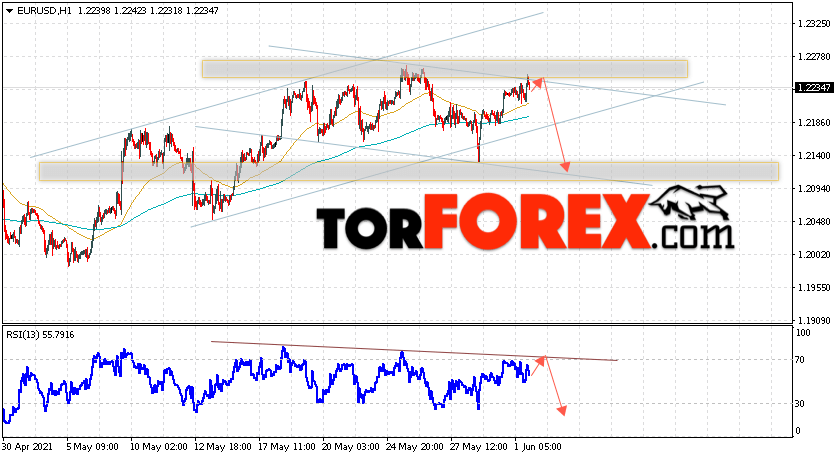 Таким образом, EUR/USD прогноз Евро Доллар на 2 июня 2021 предполагает развитие коррекции и тест области сопротивления вблизи уровня 1.2255. Откуда стоит ожидать отскок и попытку продолжения падения пары в область ниже уровня 1.2115. В пользу падения валютной пары выступит тест линии тренда на индикаторе относительной силы. Отменой варианта снижения пары EUR/USD станет сильный рост котировок и пробой уровня 1.2305. Это укажет на пробой области сопротивления и продолжение подъёма валютной пары на Форекс в область выше уровня 1.2575.