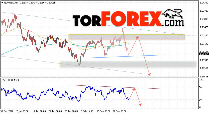 Валютная пара Евро Доллар EUR/USD продолжает движение в рамках коррекции и формирования разворотной модели ”Голова и плечи”. Скользящие средние указывают на наличие краткосрочной бычьей тенденции по паре. Однако цены пробили область между сигнальным линиями, что указывает на давление со стороны продавцов европейской валюты и потенциальное продолжение падения котировок уже с текущих уровней. В момент публикации прогноза курс Евро к Доллару США составляет 1.2042. В рамках Форекс прогноза на 2 марта 2021 стоит ожидать попытку развития роста и тест уровня сопротивления, который располагается на паре вблизи области 1.2175. Далее, отскок и продолжение падения валютной пары Евро Доллар. Потенциальной целью такого движения на FOREX выступает область ниже уровня 1.1865.