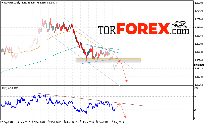 Таким образом, EUR/USD прогноз Евро Доллар на 20 — 24 августа 2018 предполагает попытку теста верней границы нисходящего канала вблизи уровня 1.1530, откуда стоит ожидать начала падения пары в область ниже уровня 1.0950, в пользу снижения выступит тест линии тренда на индикаторе относительной силы, отменой варианта падения евро доллар станет сильный рост и пробой уровня 1.1600, в этом случае стоит ожидать продолжения роста пары с потенциальной целью на уровне 1.1950.