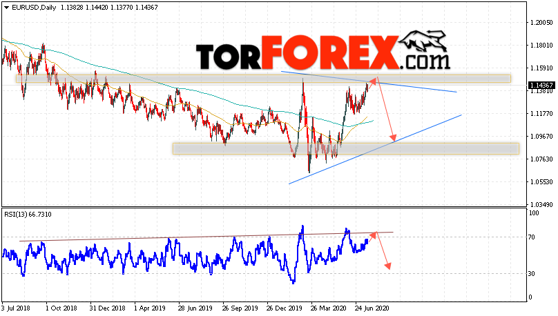 В пользу падения валютной пары EUR/USD на Форекс выступит тест линии сопротивления на индикаторе относительной силы. Вторым сигналом станет отскок от верхней границы модели «Треугольник». Отменой варианта падения котировок пары Евро Доллар на текущей торговой неделе 20 — 24 июля 2020, станет сильный рост и пробой уровня 1.1645. Это укажет на пробой области сопротивления и продолжения роста пары в область выше уровня 1.2015. С пробоем области поддержки и закрытием котировок ниже уровня 1.1075 стоит ожидать подтверждения развития медвежьего движения по паре и завершение формирования разворотной модели «Двойная вершина».