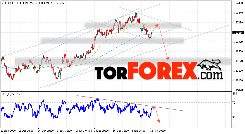 Таким образом, EUR/USD прогноз Евро Доллар на 20 января 2021 предполагает развитие коррекции и тест области сопротивления вблизи уровня 1.2175. Откуда стоит ожидать отскок и попытку продолжения падения пары в область ниже уровня 1.1825. В пользу снижения валютной пары выступит тест линии тренда на индикаторе относительной силы. Отменой варианта падения пары EUR/USD станет сильный рост котировок и пробой уровня 1.2265. Это укажет на пробой области сопротивления и продолжение подъёма валютной пары на Форекс в область выше уровня 1.2395.