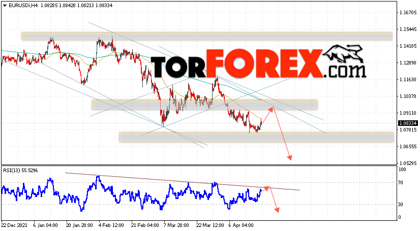 Таким образом, EUR/USD прогноз Евро Доллар на 21 апреля 2022 предполагает попытку продолжения развития бычьей коррекции и тест области сопротивления вблизи уровня 1.0915. Откуда стоит рассматривать отскок цены вниз и попытку продолжения падения валютной пары на рынке в область ниже уровня 1.0535. В пользу снижения инструмента на рынке Форекс выступит тест нисходящей линии тренда на индикаторе относительной силы (RSI). Отменой варианта падения пары EUR/USD станет сильный рост котировок и пробой уровня 1.1045. Это укажет на пробой области сопротивления и продолжение подъёма валютной пары на Форекс в область выше уровня 1.1265.
