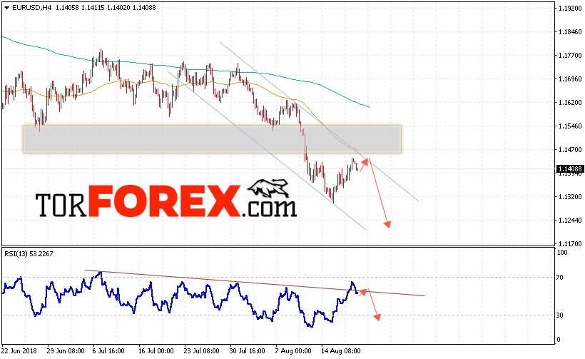 Таким образом, EUR/USD прогноз Евро Доллар на 21 августа 2018 предполагает попытку теста области сопротивления вблизи уровня 1.1415, откуда стоит ожидать отскок и попытку продолжения падения пары в область ниже уровня 1.1225, в пользу снижения выступит тест линии тренда на индикаторе относительной силы, отменой варианта падения EUR/USD станет сильный рост и пробой уровня 1.1460, что укажет на пробой области сопротивления и продолжение роста пары в область выше уровня 1.1580.