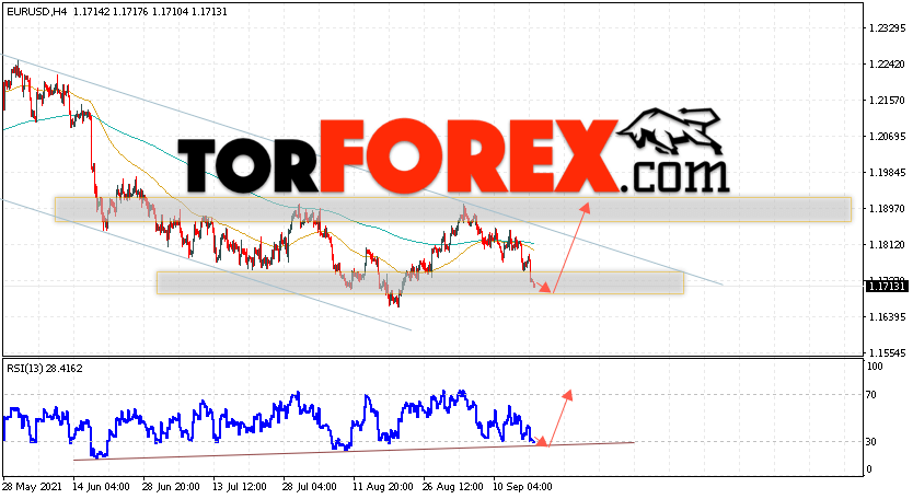 Таким образом, EUR/USD прогноз Евро Доллар на 21 сентября 2021 предполагает развитие коррекции и тест области поддержки вблизи уровня 1.1695. Откуда стоит ожидать отскок и попытку роста падения пары в область выше уровня 1.1895. В пользу подъёма валютной пары выступит тест линии тренда на индикаторе относительной силы (RSI). Отменой варианта роста пары EUR/USD станет падение котировок и пробой уровня 1.1625. Это укажет на пробой области поддержки и продолжение падения валютной пары на Форекс в область ниже уровня 1.1455.