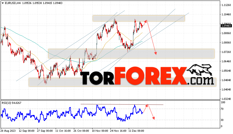 Таким образом, EUR/USD прогноз Евро Доллар на 22 декабря 2023 предполагает попытку развития бычьей коррекции пары и тест области сопротивления вблизи уровня 1.0975. Откуда стоит рассматривать отскок цены пары Евро Доллар вниз и попытку продолжения снижения актива на рынке в область ниже уровня 1.0705. Дополнительным сигналом в пользу снижения инструмента на рынке Форекс выступит тест линии тренда на индикаторе относительной силы (RSI). Отменой варианта падения пары EUR/USD станет сильный рост котировок и пробой уровня 1.1105. Это укажет на пробой области сопротивления и продолжение роста валютной пары на Форекс в область выше уровня 1.1325.