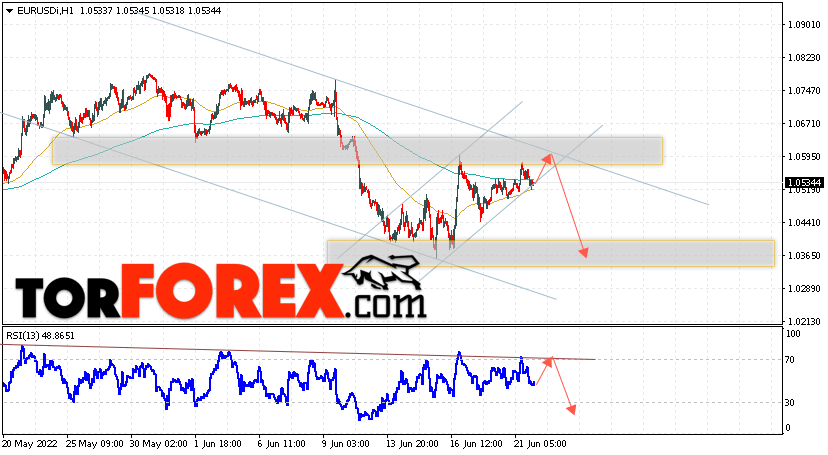 Таким образом, EUR/USD прогноз Евро Доллар на 22 июня 2022 предполагает попытку развития бычьей коррекции и тест области сопротивления вблизи уровня 1.0585. Откуда стоит рассматривать отскок цены вниз и попытку продолжения падения валютной пары на рынке в область ниже уровня 1.0365. В пользу снижения инструмента на рынке Форекс выступит тест нисходящей линии тренда на индикаторе относительной силы (RSI). Отменой варианта падения пары EUR/USD станет сильный рост котировок и пробой уровня 1.0695. Это укажет на пробой области сопротивления и продолжение подъёма валютной пары на Форекс в область выше уровня 1.0825.