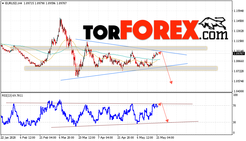 Таким образом, EUR/USD прогноз Евро Доллар на 22 мая 2020 предполагает развитие коррекции и тест области сопротивления вблизи уровня 1.1005. Откуда стоит ожидать отскок и попытку продолжения падения пары в область ниже уровня 1.0545. В пользу снижения валютной пары выступит тест линии тренда на индикаторе относительной силы. Отменой варианта падения EUR/USD станет сильный рост и пробой уровня 1.1095. Это укажет на пробой сопротивления и продолжение подъёма валютной пары на Форекс в область выше уровня 1.1295.