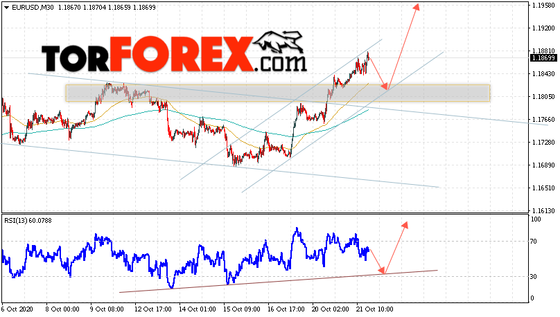 Таким образом, EUR/USD прогноз Евро Доллар на 22 октября 2020 предполагает развитие коррекции и тест области поддержки вблизи уровня 1.1825. Откуда стоит ожидать отскок и попытку продолжения роста пары в область выше уровня 1.1965. В пользу подъёма валютной пары выступит тест линии тренда на индикаторе относительной силы. Отменой варианта роста EUR/USD станет падение и пробой уровня 1.1765. Это укажет на пробой поддержки и продолжение падения валютной пары на Форекс в область ниже уровня 1.1525.