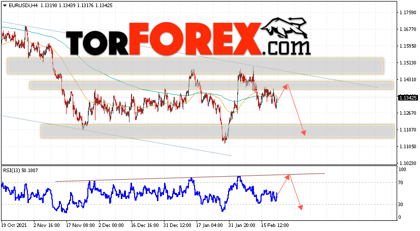 Таким образом, EUR/USD прогноз Евро Доллар на 23 февраля 2022 предполагает попытку продолжения развития бычьей коррекции и тест области сопротивления вблизи уровня 1.1415. Откуда стоит рассматривать отскок цены вниз и попытку продолжения падения валютной пары на рынке в область ниже уровня 1.1155. В пользу снижения инструмента на рынке Форекс выступит тест нисходящей линии тренда на индикаторе относительной силы (RSI). Отменой варианта падения пары EUR/USD станет сильный рост котировок и пробой уровня 1.1505. Это укажет на пробой области сопротивления и продолжение подъёма валютной пары на Форекс в область выше уровня 1.1695.